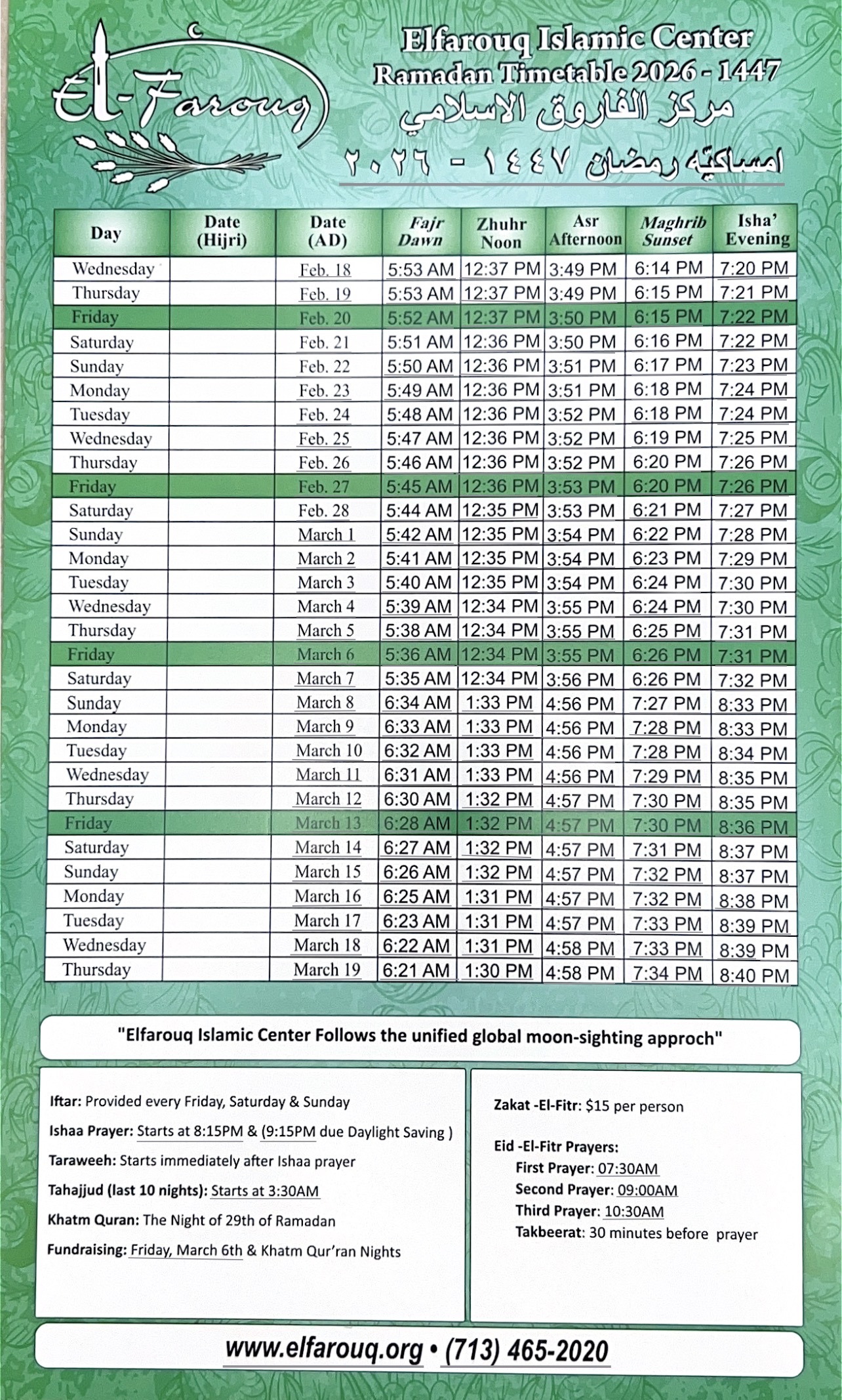 Masjid Elfarouq construction started in 1997 and completed in 1998. It is located at 1207 Conrad Sauer Drive, Houston, Texas 77043. The masjid was named after the second Caliph in Islam, the leader of the believers, ElFarouq Omar Ibn El-Khattab, may Allahﷻ be pleased with him.